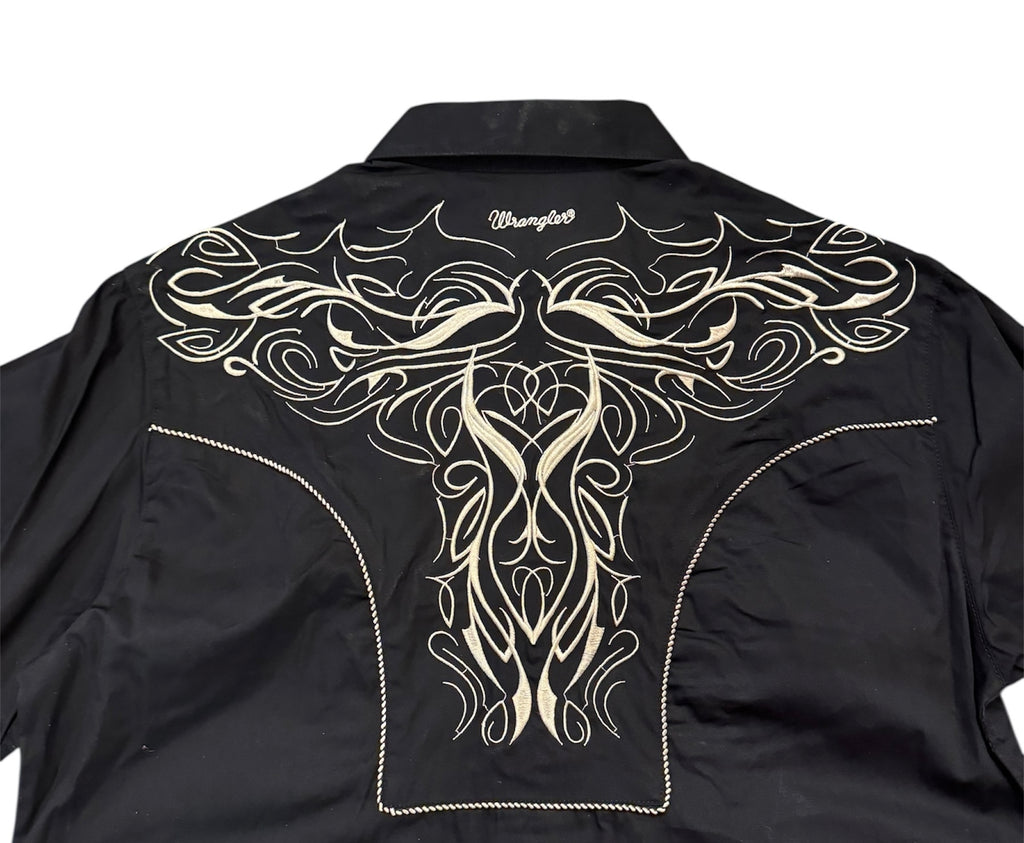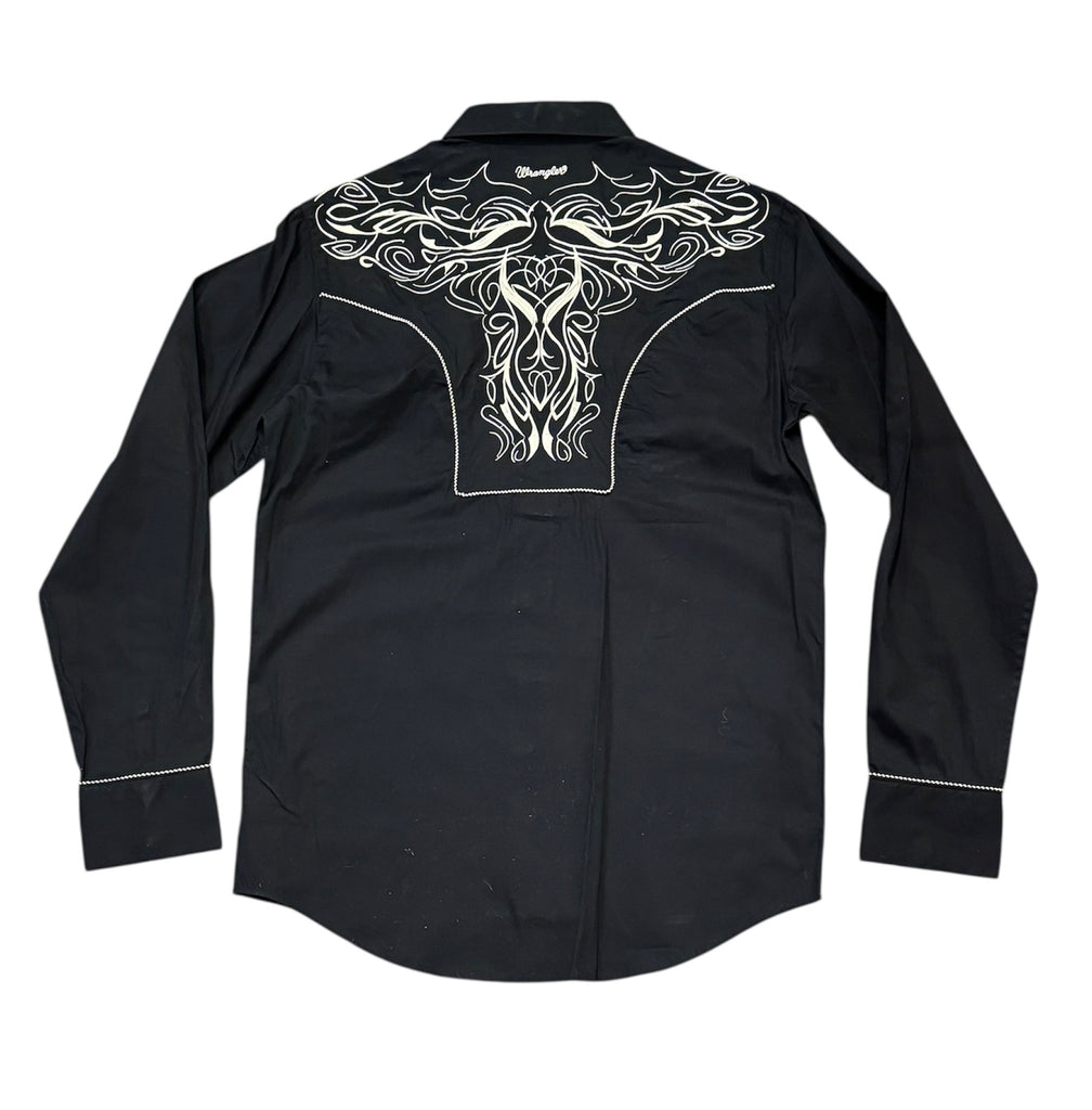 Classic western long sleeve shirt withoriginal hand drawn embroideredfront and back yokes, snap closure,piping detail (on front placket, sleevecuffs, front and back yokes)